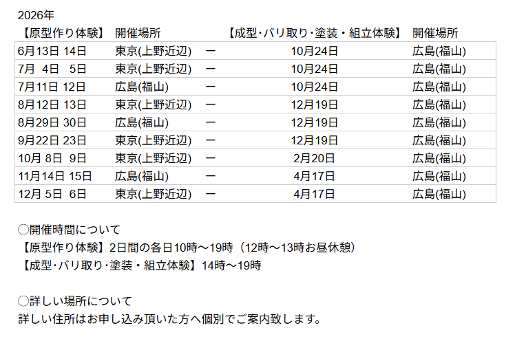 原型から完成まで体験して学べるオリジナルソフビ人形教室では「原型作り体験の2日間」と「成型・バリ取り・塗装・組立体験の1日」の2つのパートで構成されています。